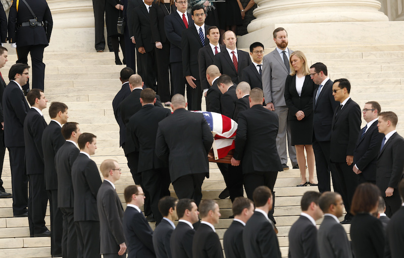 The casket of late U.S. Supreme Court Justice Antonin Scalia arrives at the Supreme Court, where Scalia’s body will lie in repose in the court’s Great Hall in Washington on February 19, 2016, a day before his funeral service. Scalia died on February 13, 2016 at the age of 79. REUTERS/Gary Cameron – TPX IMAGES OF THE DAY – RTX27QLJ